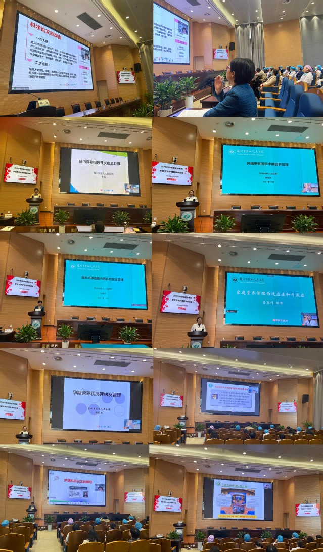 苏州九院营养科主任张琴、护理部主任肖佩华、副主任李莉、科护士长陆龙妹、护士长茅惠丽在行政楼学术报告厅为线上、线下的学员讲解了《家庭营养管理的适应症和并发症》、《脑卒中患者肠内营养的安全管理》、《肠内营养并发症的护理》、《孕期营养状况评估及管理》、《肿瘤患者围手术期营养管理》,护理专家们用她们专业的营养护理知识和丰富的临床经验无私进行了分享,达到本地区内护理专业水平的同质化提升,取得了预期的效果。