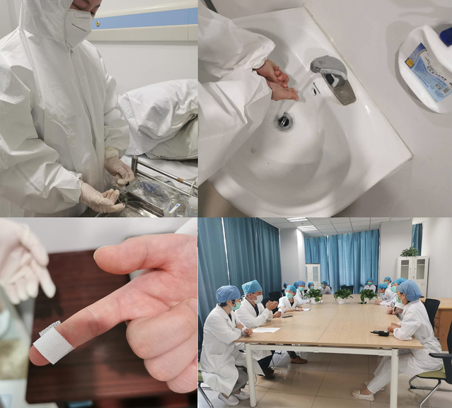 模拟场景为护士在留观病室为患者输液时发生**伤,先就近脱去手套,从近心端向远心端轻柔挤压受伤手指挤出受伤部位血液,使用流动水进行冲洗,用75%乙醇或碘伏消毒并包扎刺伤部位后戴上清洁手套,并汇报新冠防控办、感染管理科。防控办、感染管理科接到报告后组织医院专家评估暴露风险。经过专家组讨论,评估此次暴露风险较低,故不需要进行隔离观察,医务人员按血液体液暴露进行常规处理。