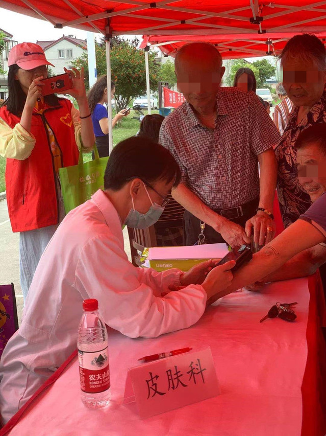 5月28日,凌昕主任参加汾湖高新区社会事业局发起的“我为群众办实事、救助暖人心”的义诊活动,现场开处方,诊治各类顽固性皮肤病,向群众普及皮肤病护理及预防知识,得到群众的欢迎。