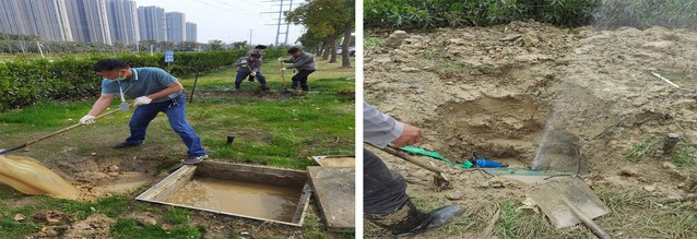 为了尽快找出漏水点,减少水资源浪费,机电维修组全体成员立刻展开抢修水管的工作。烈日炎炎下,总务处工作人员和维修班组加班加点进行开挖。由于绿化带紧挨阀门井,导致开挖的难度加大,但大家迎难而上,齐心配合,克服重重困难,终于找到了破漏水管。