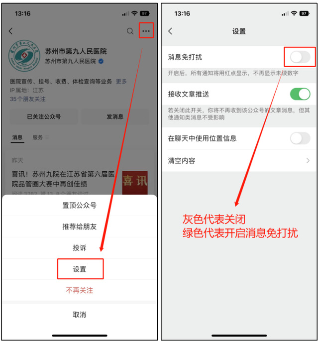 1、公众号搜索“苏州市第九人民医院”,关注我院公众号后,点击右上角“...”,点击设置,关闭“消息免打扰”按钮。