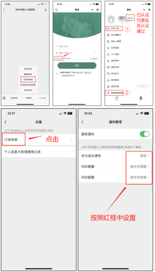 2、打开“微官网”中的“互联网医院”,点击“我的”,选择“立即注册”,填写个人信息后,点击“实名认证”,完成实名认证后,点击微信授权设置,按照截图所示设置“接收并提醒”。