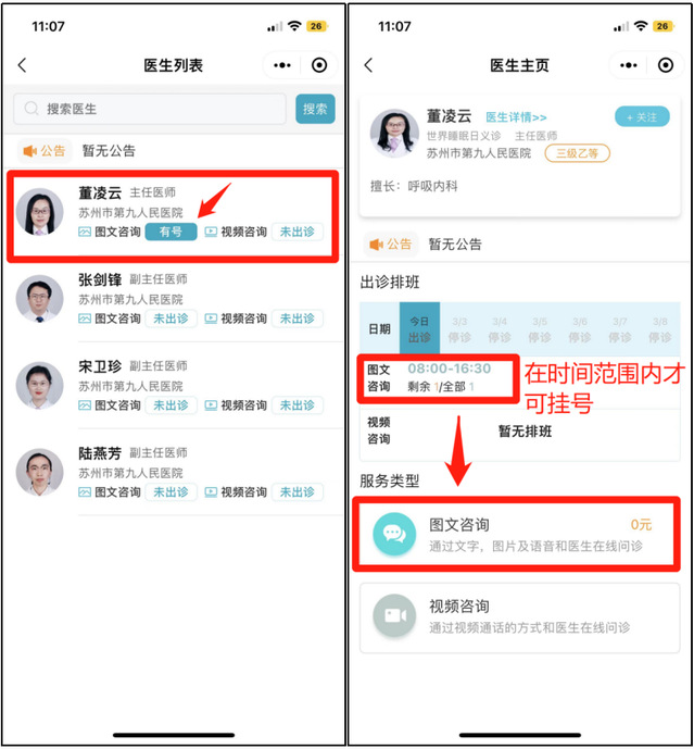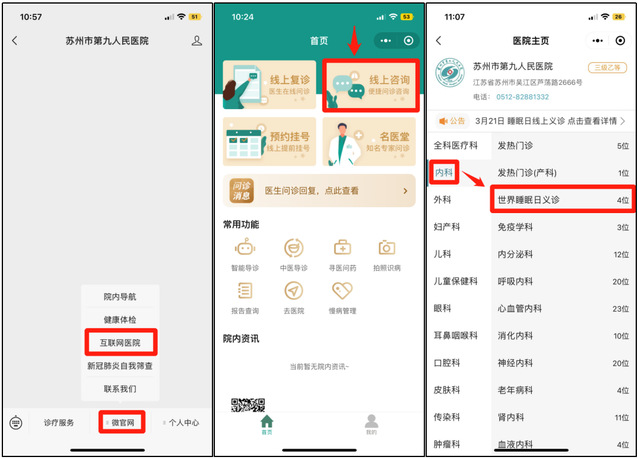微信搜索“苏州市第九人民医院”公众号关注并打开选择“微官网”点击“互联网医院”选择“线上咨询”选择内科---世界睡眠日义诊-- 医生(显示有号源)--图文咨询--填写信息提交问诊--等待医生接诊。