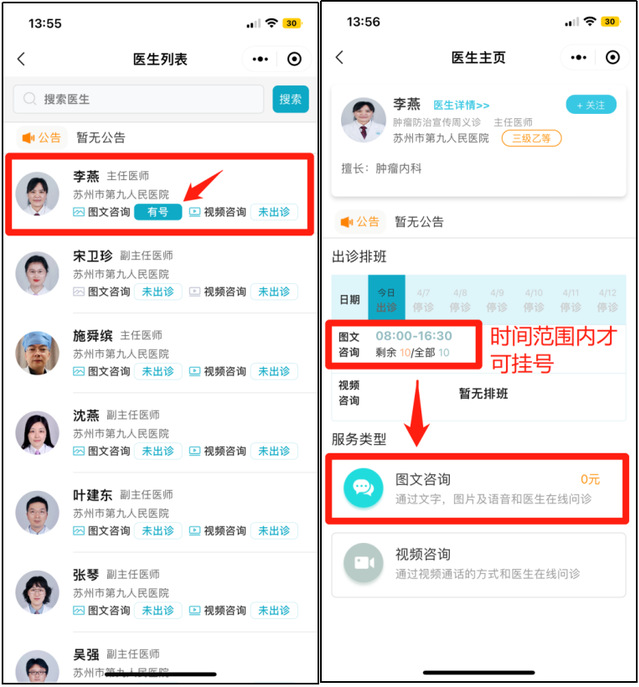 微信搜索“苏州市第九人民医院”公众号关注并打开选择“微官网”点击“互联网医院”选择“线上咨询”选择内科--肿瘤防治宣传周义诊-- 医生(显示有号源)--图文咨询--填写信息提交问诊--等待医生接诊。
