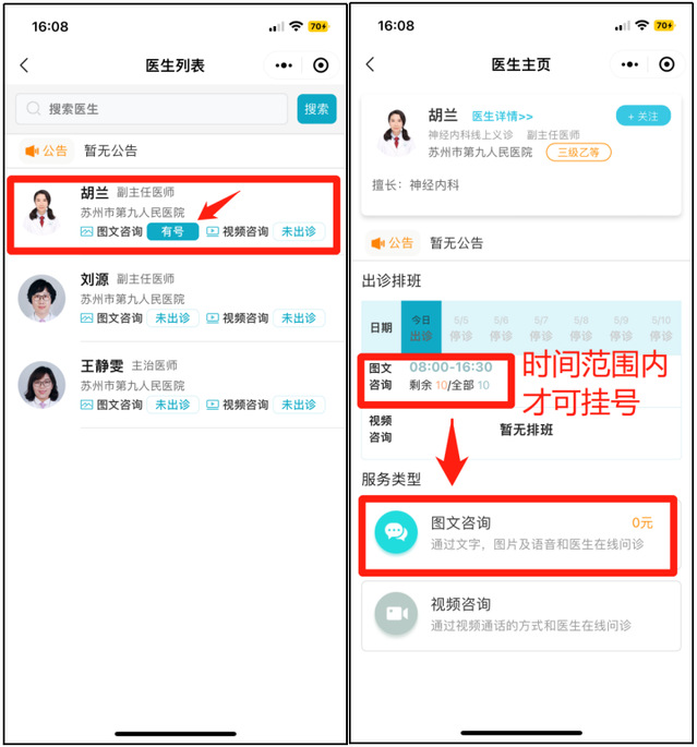 微信搜索“苏州市第九人民医院”公众号关注并打开选择“微官网”点击“互联网医院”选择“线上咨询”选择内科--神经内科线上义诊-- 医生(显示有号源)--图文咨询--填写信息提交问诊--等待医生接诊。