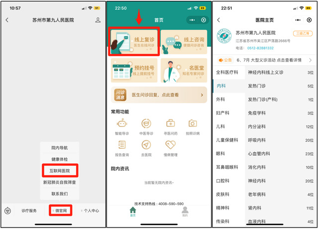微信搜索“苏州市第九人民医院”公众号关注并打开选择“微官网”点击“互联网医院”选择“线上复诊”或者“线上咨询”选择科室--医生(显示有号源)--填写信息提交问诊--等待医生接诊。