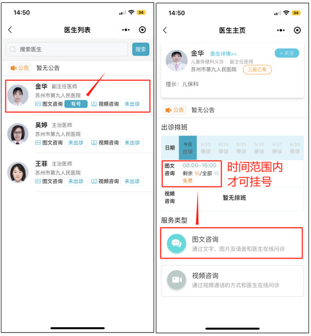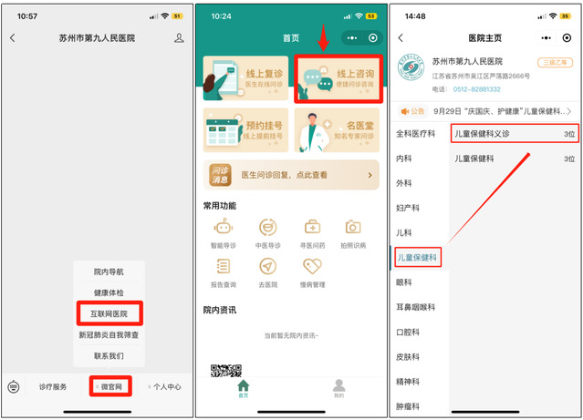 微信搜索“苏州市第九人民医院”公众号关注并打开选择“微官网”点击“互联网医院”选择“线上咨询”选择儿童保健科--儿童保健科义诊-- 医生(显示有号源)--图文咨询--填写信息提交问诊--等待医生接诊。