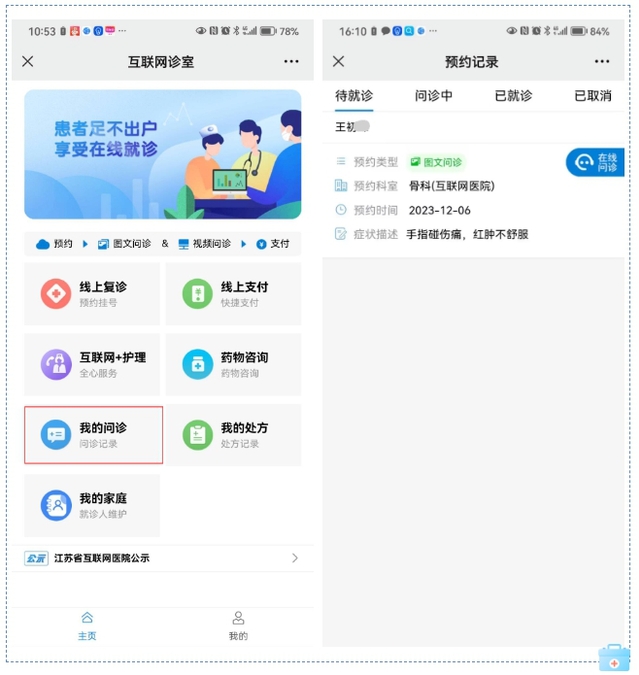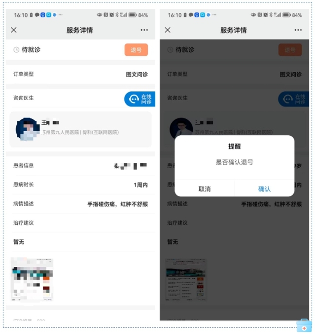 ✔选择“我的问诊”查看预约记录,如果还在待接诊列表中表示医生还未接诊,可以自行退号。