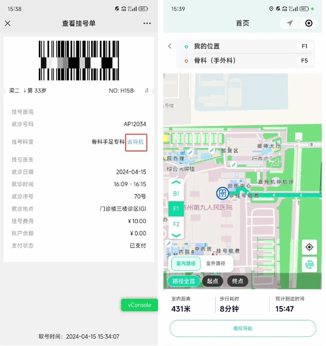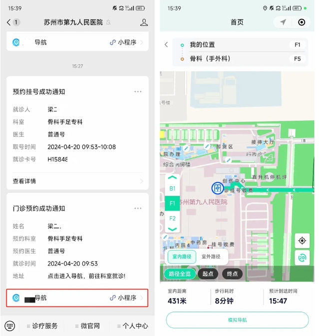 在微信公众号预约挂号后,公众号会自动推送预约成功通知,点击通知下部的导航小程序链接,即可进入院内智能导航一键导航到预约的就诊科室。