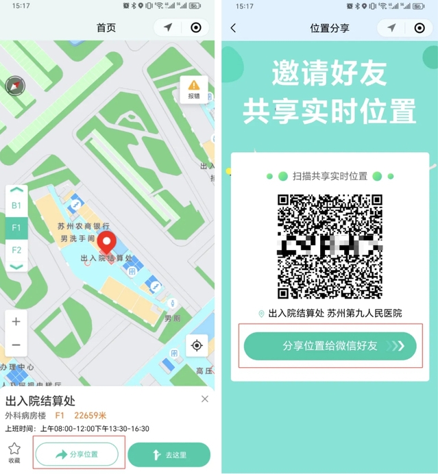 亲属到医院来看望,或者一起来医院就诊的亲友走散了,只需通过微信将位置分享给好友,或者与好友共享实时位置,对方就能直接导航到你所在的位置了,为亲友间开启专属“快速”通道。