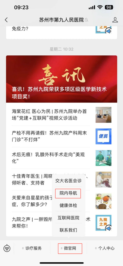 微信搜索“苏州市第九人民医院”关注医院公众号,点击底部菜单“微官网-院内导航”,即可进入院内导航小程序。(提示:使用“院内导航”需要打开手机蓝牙)