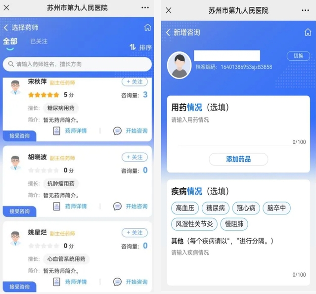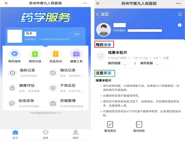 只要在苏州九院就诊配药的患者,均可在“药学服务”中生成智能用药指导单,方便患者随时随地查询所开具药品的服用方法、给药时间、注意事项等信息,并可自主开启服药(购药)提醒功能。同时,针对患者用药疑问,“药学服务”每日均由专业药师开展一对一在线咨询,为患者答疑解惑,提供用药建议,真正实现药学服务“一触即达”。