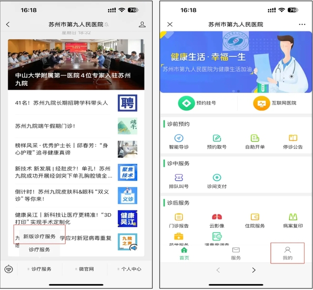 搜索并关注“苏州市第九人民医院”公众号,在“诊疗服务”——“我的”——“就诊人信息”中添加就诊人信息,并确保就诊手机号与微信绑定的相一致。