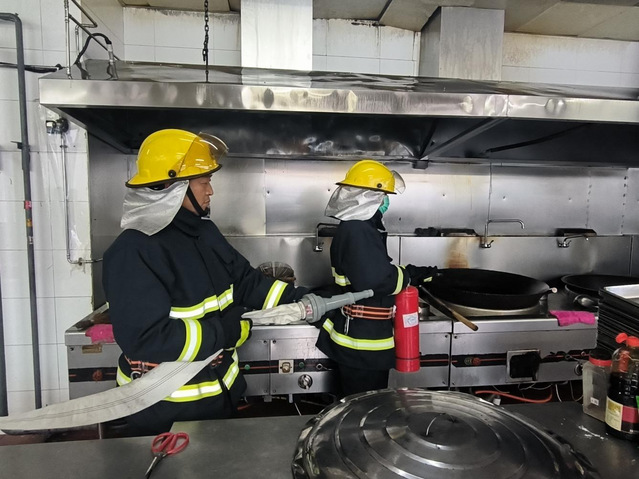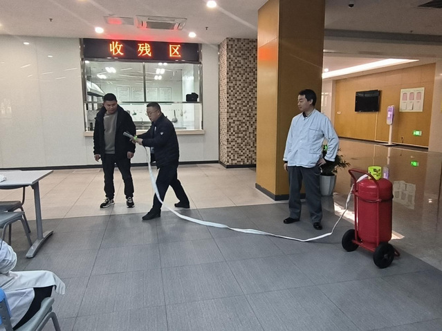 在培训环节,保卫处工作人员详细讲解了厨房火灾预防知识、如何报火警、消防器材的正确使用方法以及火灾逃生的要点等内容。理论培训结束后开展实战演练。模拟食堂灶台炒菜时突发火灾场景,工作人员反应迅速,第一时间按下消防手报、拨打火警电话,同时果断关闭燃气和电源,防止火势进一步蔓延,并运用培训所学知识,用灭火器、灭火毯等器材进行灭火扑救,根据现场火势情况有序组织疏散。与此同时,医院消防控制室接到警报后,立即启动应急预案,迅速组织附近保安及微型消防站灭火组人员携带专业灭火装备赶赴现场支援。经过一番紧张扑救,最终成功扑灭大火。整个演练过程紧张有序、环环相扣,各环节衔接顺畅,达到了预期的演练效果。