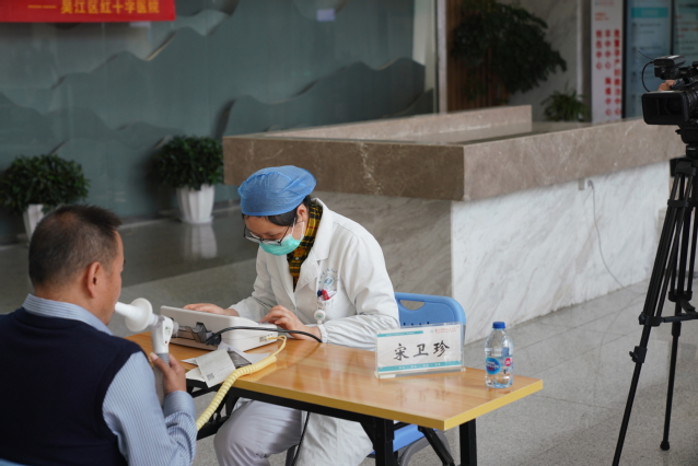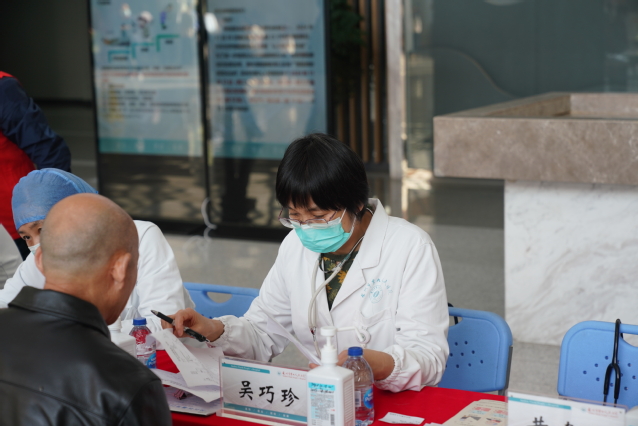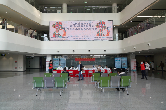 医院门诊一楼大厅,呼吸与危重症医学科学科带头人吴巧珍主任医师,苏州九院呼吸与危重症医学科首席专家级特聘主任黄建强主任(中山大学附属第一医院呼吸与危重症医学科主任医师、诊断学教研室副主任),科主任胡晓蕴主任医师,科副主任董凌云及张剑锋主任医师,科室宋卫珍、郑江南副主任医师及药学部宋秋萍副主任药师、庄伏志主管药师参与义诊活动,为群众提供慢阻肺相关知识咨询,并指导慢阻肺患者正确吸入药物的使用方法,同时安排了免费肺功能、呼出气一氧化氮检查。