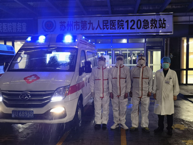 2022年2月18日下午我站接到卫健委紧急通知,苏州市急救中心要启动阳性感染者转运专车,需要我站安排人员和车辆当晚到苏州**待命。接到任务后,医生罗进贤、护士高丁源、司机张建民,刚下夜班在家的他们毫无犹豫准备好换洗衣服,立即赶到站里报到。虽然大家心里都知道此次任务有一定的风险,作战时间也未知,但他们都没有一丝犹豫!连夜出征到达苏州指定隔离酒店**,立即投入作战!