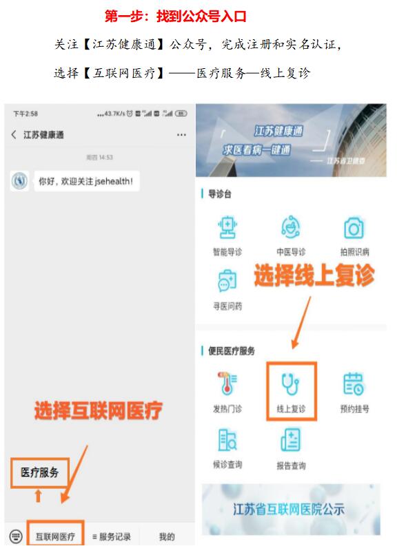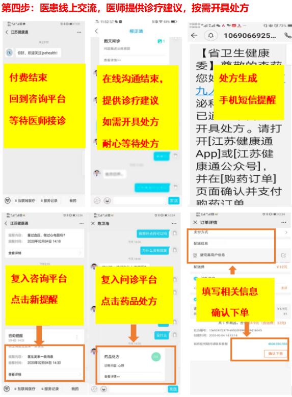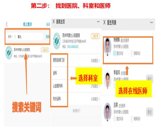 市民可以通过关注【江苏健康通】公众号,完成注册和实名认证,选择【互联网医疗】--医疗服务--线上复诊,搜索【苏州市第九人民医院】,进入九院的互联网医院,选择科室与医生,进行互联网医院的复诊、购药,以及咨询,填写配送信息,确认无误后,点击【确认下单】,药品可以直接快递到家。网上服务时间:8:00-12:00,13:30-16:30。详细操作参考以下流程图: