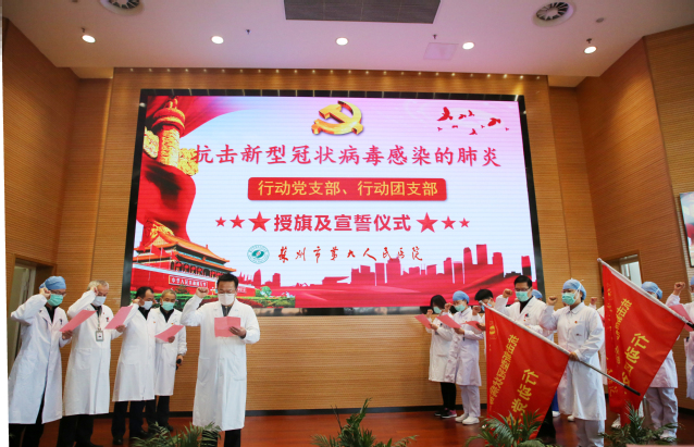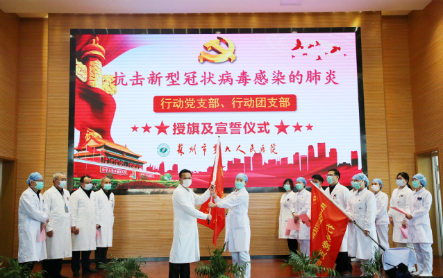 苏州九院李金彪带领在场的抗击新型冠状病毒感染的肺炎行动党支部和行动团支部成员及医护人员志愿者进行庄严宣誓,坚决做到一切听党指挥,召之即来,来之能战,全身心投入抗击疫情的各种工作,不畏惧、不退缩、不计较个人得失,冲锋在前,全力以赴、不辱使命,用实际行动去实现在党旗下的誓言,做一个为维护人民群众的健康无私奉献、敢为人先的九院人,坚决打赢疫情防控阻击战,筑起保护人民群众生命安全的钢铁长城。