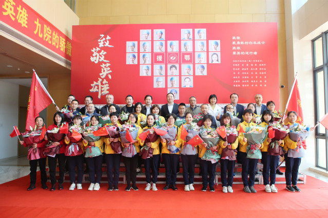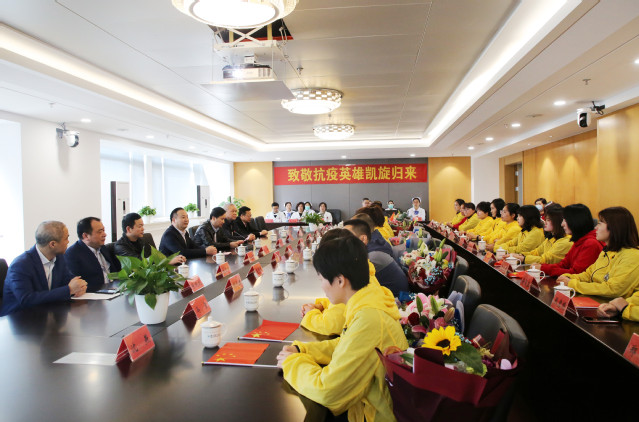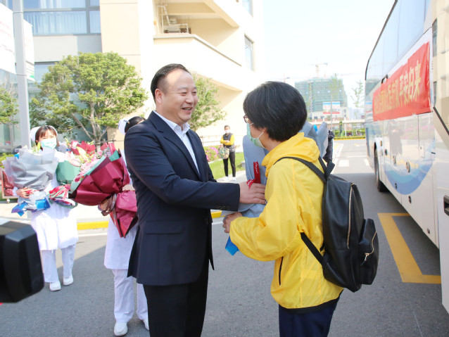 吴江区卫健委党委书记、主任、苏州九院党委书记沈宇,苏州九院党委副书记、院长沈根海与队员亲切握手,送上鲜花;其他同事们满含深情送上久违的拥抱。