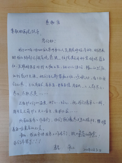 为了全力抢救患者,呼吸与危重症医学科医护人员克服了许多难以想象的困难。在这次疫情中,医护人员大量感染、减员是一大特点,但大家都在咬牙坚持,全力做好各项救治工作,胡晓蕴表示,在这场没有硝烟的战争中,我们医务人员责无旁贷,呼吸人更是理所应当冲锋在前,患者的病情好转,就是对医护最大的安慰。尤其是收到患者的感谢信,是对我们医护最大的鼓舞和激励。