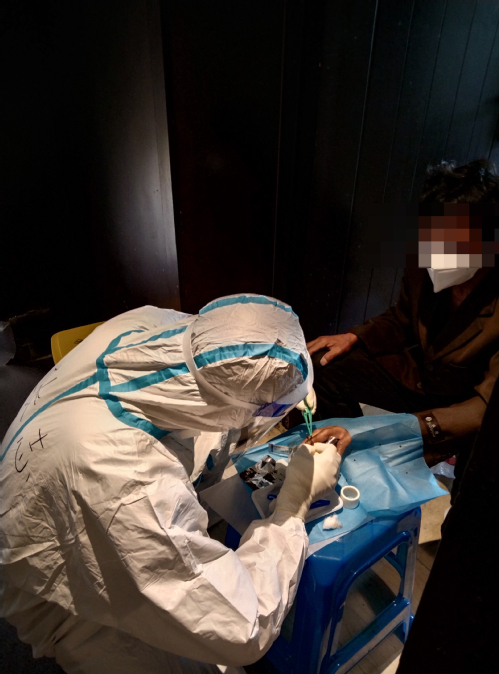 依稀记得在这次疫情中,第一次接到采核酸任务是2月16日的晚上,那天气温很低,还下着雨夹雪,到了社区边采样边进行手消毒的时候,觉得手都冻麻了。转眼到了4月12日,援助太仓进行采样,那天顶着33度的高温,穿上大白,往采样棚里一坐,就浑身冒汗,又碰上信息输入系统故障,从早上6点半一直工作到下午1点半,采样任务结束后,浑身都湿透了,这次同是医务人员的爱人接到4月18日去黄码医院的任务,我就报名去了封控区的闭环任务,没想到我还比她早出发了一天。4月17日,我来到了封控区,开始扫楼,为每一户居民上门采核酸。在这次任务的16天中,体验到了领队的艰辛,不单要完成采样工作,还要进行一些相关工作的协调。
