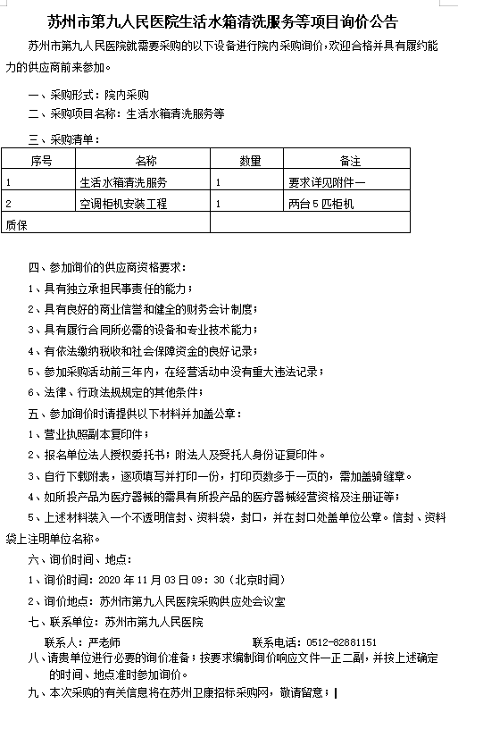 苏州市第九人民医院生活水箱清洗服务等项目询价公告