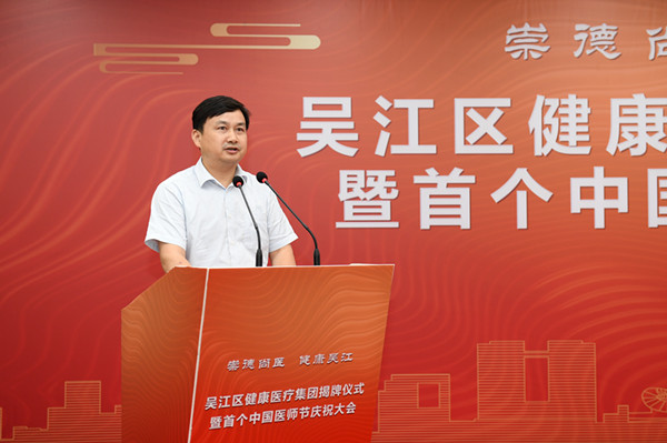 在8月17日举行的吴江区健康医疗集团揭牌仪式暨**中国医师节庆祝大会上,区委书记沈国芳,区委副书记、区长李铭,苏州市卫计委副主任盛乐为三大“健康医疗集团”揭牌。