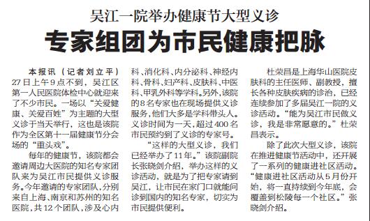 杜荣昌是上海华山医院皮肤科的主任医师、副教授,擅长各种皮肤疾病的诊治,已经连续参加了多届吴江一院的义诊活动。“能为吴江市民做义诊,我是非常愿意的。”杜荣昌表示。