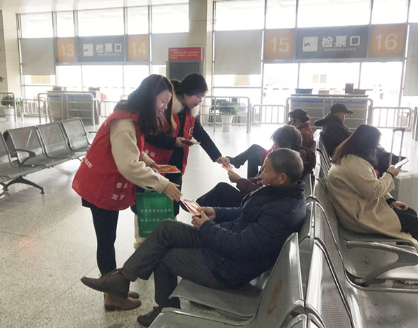 健康志愿者开展健康宣教,向群众分发宣传健康知识小册子,分发暖宝宝、健康口袋,送出春联、福字等,为回家过年的群众送去健康、送去祝福,造浓节日氛围。