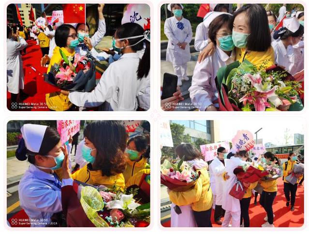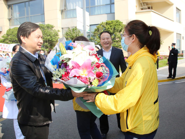 吴江区卫健委党委书记、主任、苏州九院党委书记沈宇,苏州九院党委副书记、院长沈根海与队员亲切握手,送上鲜花;其他同事们满含深情送上久违的拥抱。