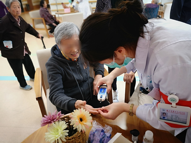 随后团队医护人员为老人们进行了健康义诊,场面十分热闹。医务人员认真地为老人们测量血压、血糖,耐心细致地询问病情,分析病因,提出治疗方案,讲解预防保健知识及饮食、活动、合理用药等卫生安全知识。