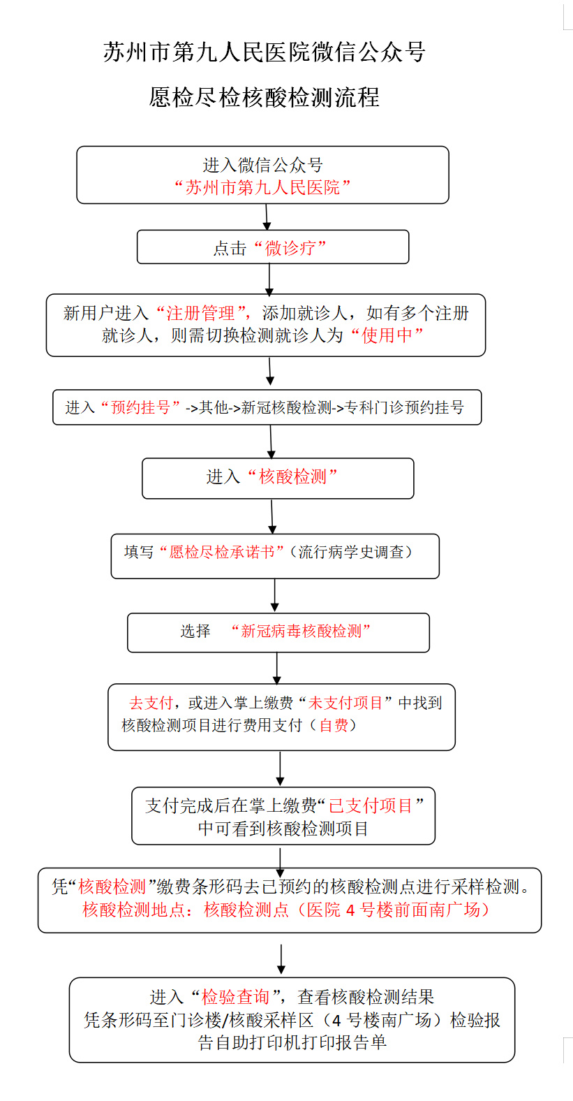 对于自愿检测新冠肺炎核酸的健康人员,苏州九院2月6日起开通“新冠核酸检测筛查门诊”分时预约,请提前通过微信公众号核酸检测预约挂号并自助开单,掌上缴费后直接去4号楼南广场核酸检测点登记采样检测。