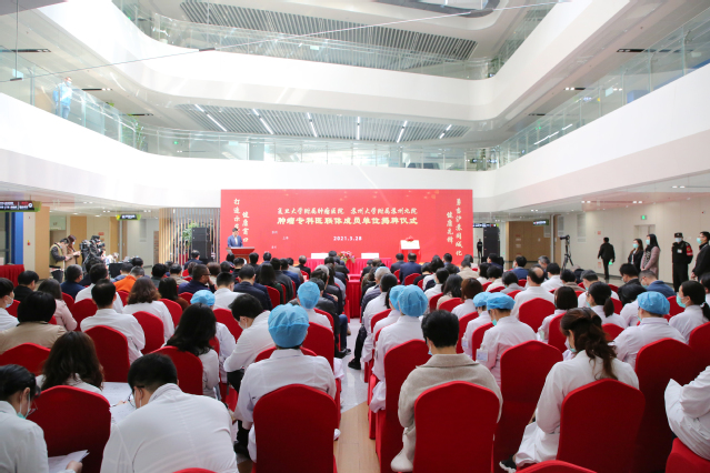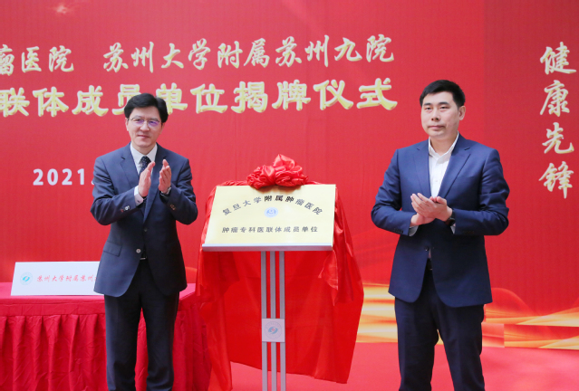3月28日,苏州九院与复旦大学附属肿瘤医院举行“肿瘤专科医联体成员单位揭牌仪式”。这是自2020年11月双方签约跨区域肿瘤防治医联体建设后,深入推进“沪苏同城化”,助推长三角健康服务一体化,编织长三角地区肿瘤防治“联合网络”,实现长三角区域肿瘤防治的全程化、同质化的又一重要里程碑。