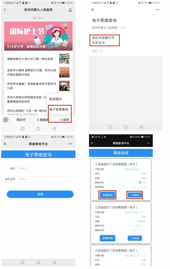 打开微信公众号“苏州市第九人民医院”,在右下方“我的”中点击“电子发票查询”,选择浏览器打开电子发票,填写患者的姓名及身份证号码,即可查看票据和下载票据。