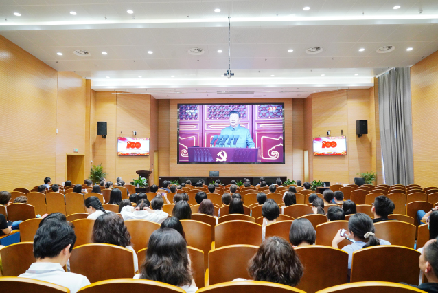 在苏州九院行政教学楼三楼学术报告厅,苏州九院党委副书记、副院长沈根海等院领导和职能科室工作人员一百余人共同观看了庆祝中国共产党成立100周年大会直播。