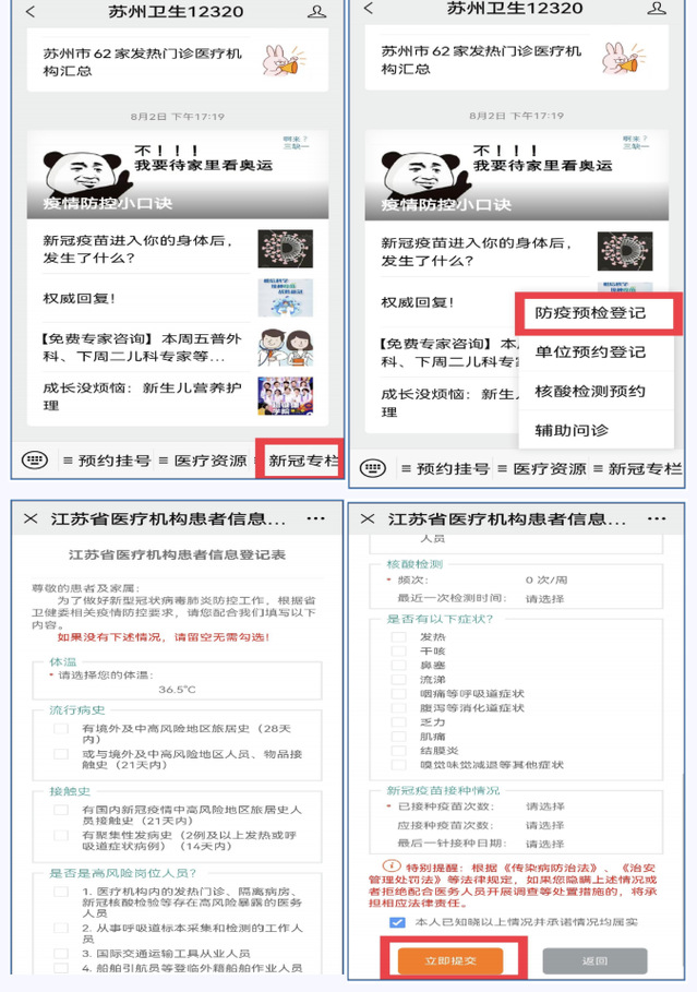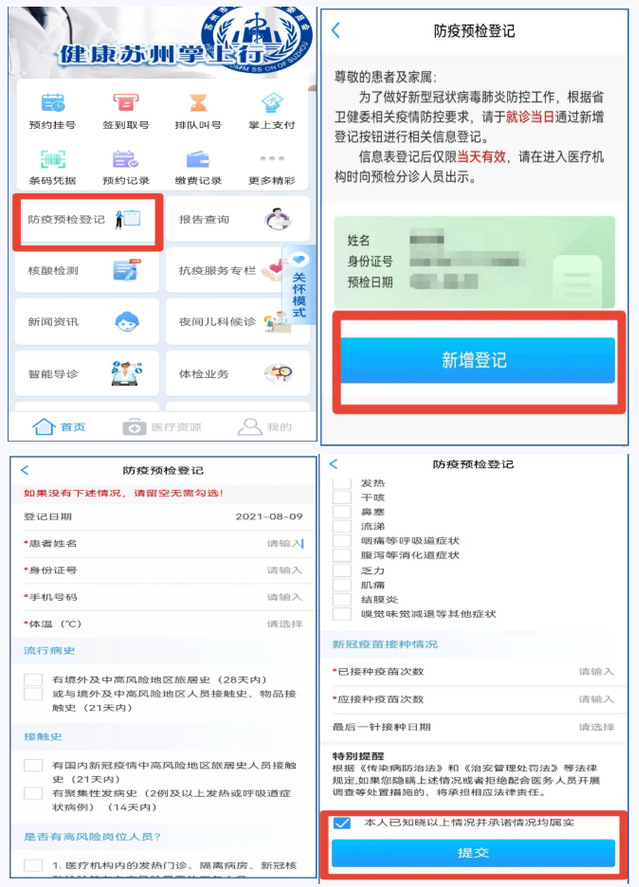 1.市民可在就诊当日通过健康苏州掌上行APP、苏州卫生12320 公众号首页菜单“新冠专栏”,点击“防疫预检登记”。选择就诊人后,登记防疫预检信息。也可通过苏州卫生 12320公众号首页菜单“预约挂号”栏选择“我要预约挂号”,在 弹出的提示框中点击“立即登记”,选择就诊人后,登记防疫预检信息。