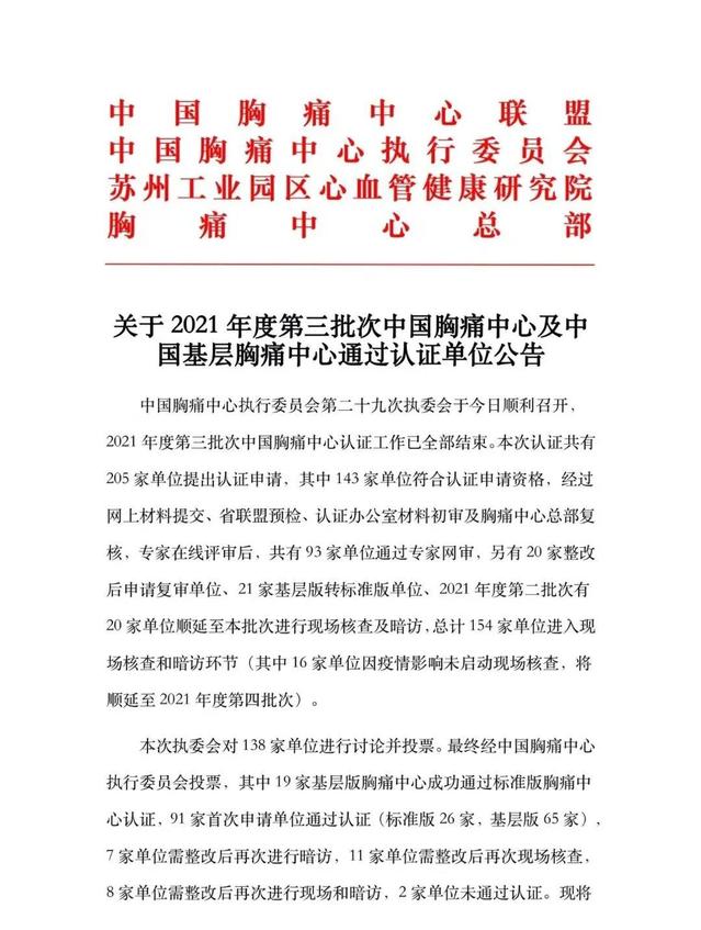 近日,2021年度第三批次中国胸痛中心认证工作顺利完成。经执行委员会投票,19家基层版胸痛中心成功通过标准版胸痛中心认证,91家首次申请单位通过认证,苏州九院名列其中,顺利通过中国胸痛中心(标准版)认证。