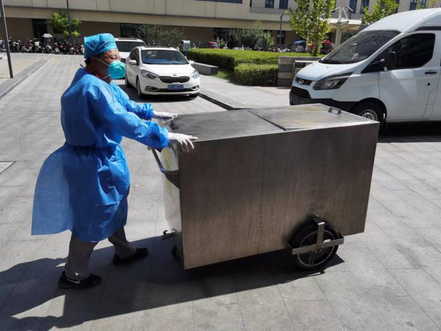 (二)医废和生活垃圾收集车经太阳一晒,温度通常都将近60℃,通体不锈钢的车身使得工人师傅推车都感到烫手。尽管如此,他们每人每天还是要走5个以上的来回。工人师傅默默地推着车,任凭太阳的暴晒,任凭汗水浸湿他们的衣裤。