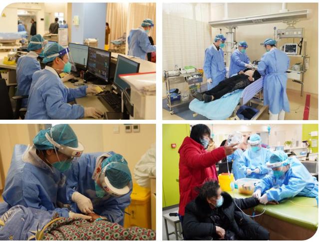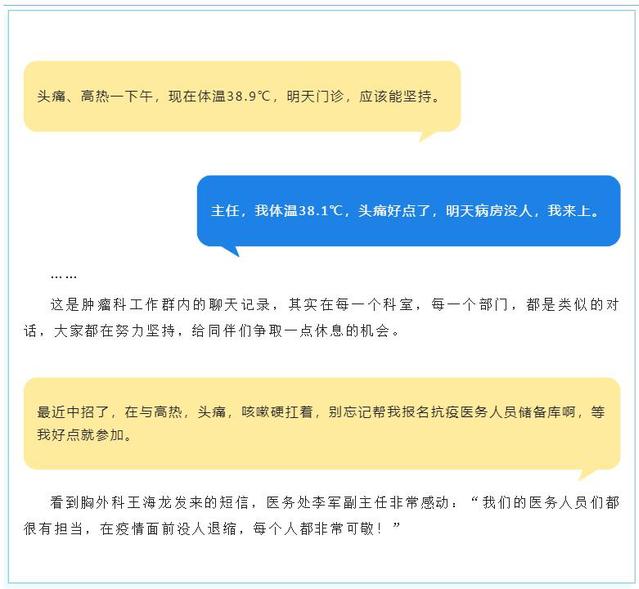 EICU金荣飞39℃还在急诊值班,王桂杰主动报名参加医院新冠重症救治队,ICU梅婉雯、宴倩、李玉卓发热39℃以上,全身酸痛、乏力,仍在坚持值班收治危重患者。换药室张丽霞带病坚持上岗,心血管内科吴雁鸣主任拖着病躯为心梗患者急诊手术,神经内科刘源主任烧一退就来医院上班,内分泌科焦雪花主任自己住院还坚持给病人查房,泌尿外科陈建春、曹志骏忍着头痛给患者手术, 消化科金颖主任自己感染了新冠,一天都没休息,坚持上班……