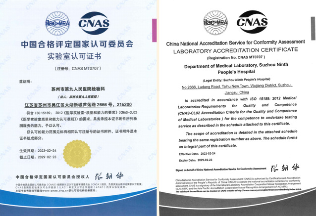 近日,苏州市第九人民医院检验科获得中国合格评定国家认可委员会(CNAS)医学实验室认可证书,是吴江首家获得CNAS认可的三级综合医院的医学实验室。