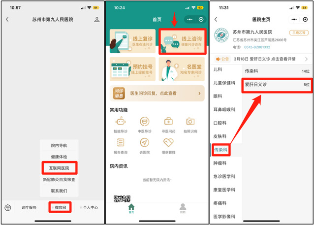 微信搜索“苏州市第九人民医院”公众号关注并打开选择“微官网”点击“互联网医院”选择“线上咨询”选择传染科---爱肝日义诊-- 医生(显示有号源)--图文咨询--填写信息提交问诊--等待医生接诊。