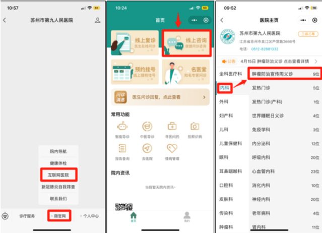 微信搜索“苏州市第九人民医院”公众号关注并打开选择“微官网”点击“互联网医院”选择“线上咨询”选择内科--肿瘤防治宣传周义诊-- 医生(显示有号源)--图文咨询--填写信息提交问诊--等待医生接诊。