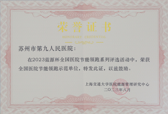 绿色发展 | 苏州九院荣获“第二届蓝源杯全国医院节能领跑示范单位”称号