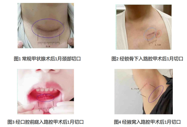 传统开刀甲状腺手术需要在颈部外露部位,术后切口瘢痕明显,对患者造成长远的心理压力和创伤(图1)。年轻女性为甲状腺疾病的高发人群,而中国女性多为瘢痕增生体质,因此颈部瘢痕对年轻女性的心理和美观影响更加明显。