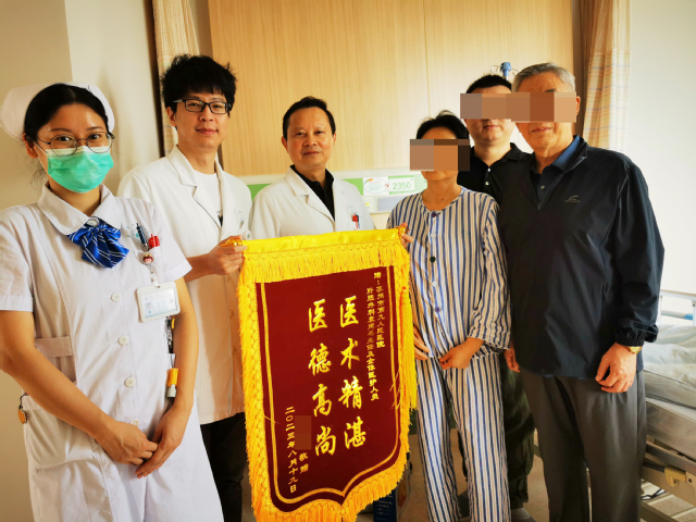 锦旗来自正在肝胆胰脾外科病区住院的李女士,在出院当天,她心心念念将锦旗送到袁建毛主任手中。