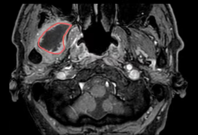 在苏州九院超声介入科,徐斌主任就接诊了这样一位患者。一个月前,患者熊先生脸颊部隐隐作痛,到医院一查是牙齿发炎了,抗炎后熊先生拔除了发炎的牙齿。但是,回家后没几天,面颊部就又开始疼痛、发热。经过反复就医、检查、消炎止痛后做增强磁共振提示:右翼外肌及颞肌异常信号,考虑脓肿可能,相关科室的医生和熊先生说这个手术可能比较复杂,需要行开放性手术。