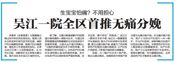 分娩痛是分娩过程中的自然生理反应。随着人类社会的进步和现代医学的发展,减轻产妇分娩期的疼痛,提高产妇分娩质量,是医务工作者追求的目标。记者从吴江区第一人民医院获悉,从10月8日起,该院将在全区首推无痛分娩,填补该技术在吴江区域的空白。